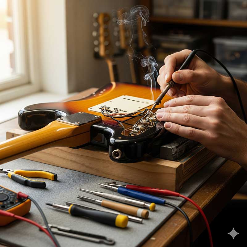 - Electronic Repairs: Fixing faulty wiring, pickups, and jacks.